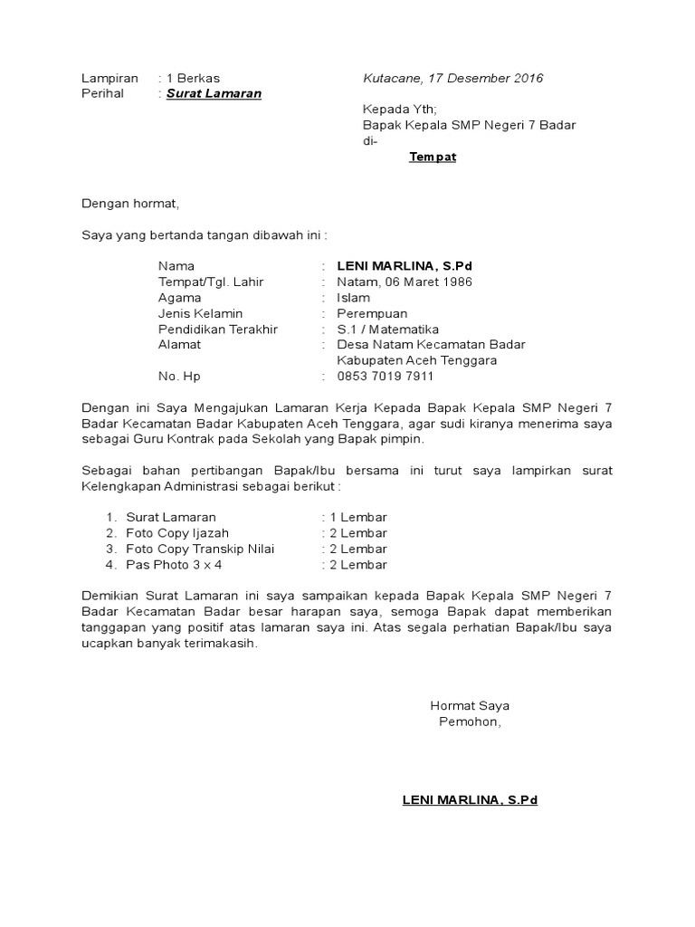 Contoh Surat Lamaran Kerja Guru Smp Negeri